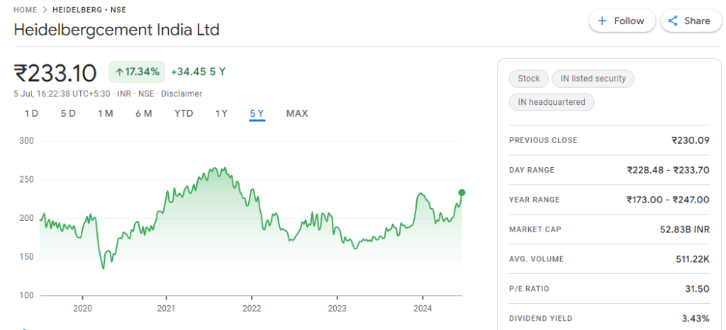 गोल से रिलेटेड है या नहीं लेकिन अगर आप मुझसे पूछेंगे तो सबसे पहले तो यहां पर अगर बात कर लेते हैं कि आपको कुछ अट्रैक्टिव शेयर्स लॉन्ग टर्म के लिए अगर मैं आपको बताऊं तो वो यहां पर जो सबसे पहला निकलता है जैसे आप देखेंगे मैंने आपको बताया सीमेंट सेक्टर कंस्ट्रक्शन सेक्टर इंफ्रा सेक्टर तो वहां से जो पहला निकलता है मेरे हिसाब से वो यहां पर हो जाता है हिडल बर्ग सीमेंट | एक जर्मन ब्रांड आपको यहां पर देखने को मिल जाएगा इसमें पोट पोटेंशियल खासी आपको दिखाई दे रही है क्यों दिखाई दे रही है निचे चार्ट देखिए जो शेयर है वो आपको चलता हुआ दिखाई देगा अपने 5 साल के लो प्राइस के आसपास |